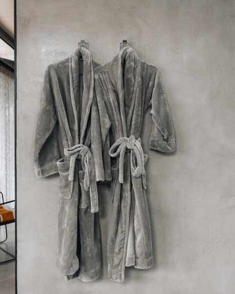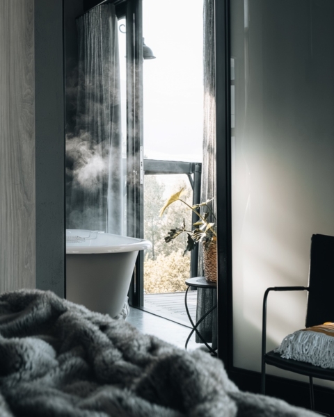 The open-plan interior features an extra-length king-size bed, a luxurious bathroom with a walk-in shower and soaker bathtub, air-conditioning, free Wi-Fi, and a fully equipped kitchenette with thoughtful touches throughout. A closed-combustion fireplace creates a cosy atmosphere on cooler evenings.